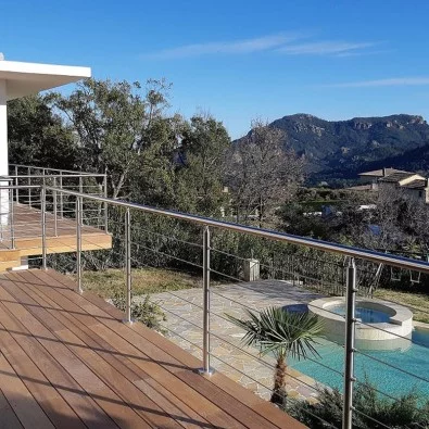 Garde-corps à câbles : solution minimaliste par excellence, il préserve la vue tout en assurant une sécurité optimale. Les câbles inox tendus horizontalement créent un effet de transparence apprécié sur les terrasses et balcons.